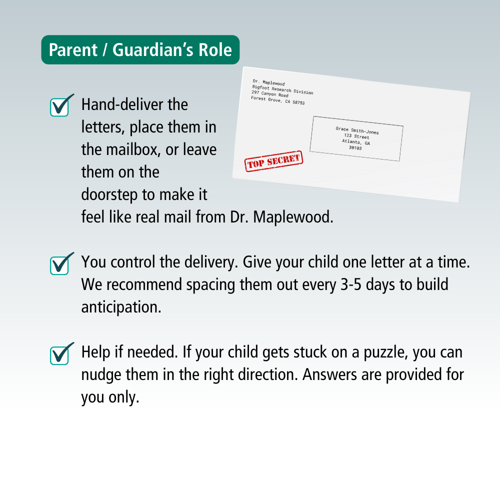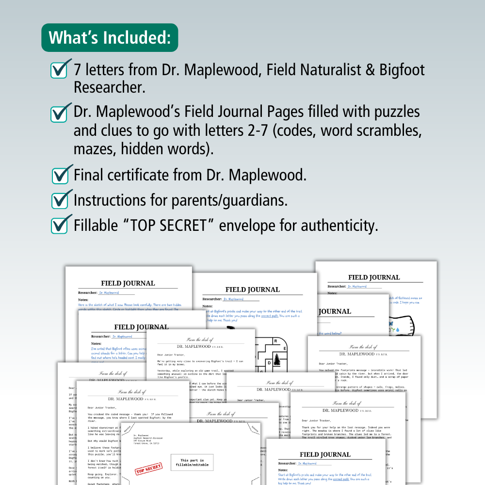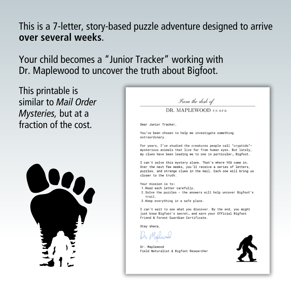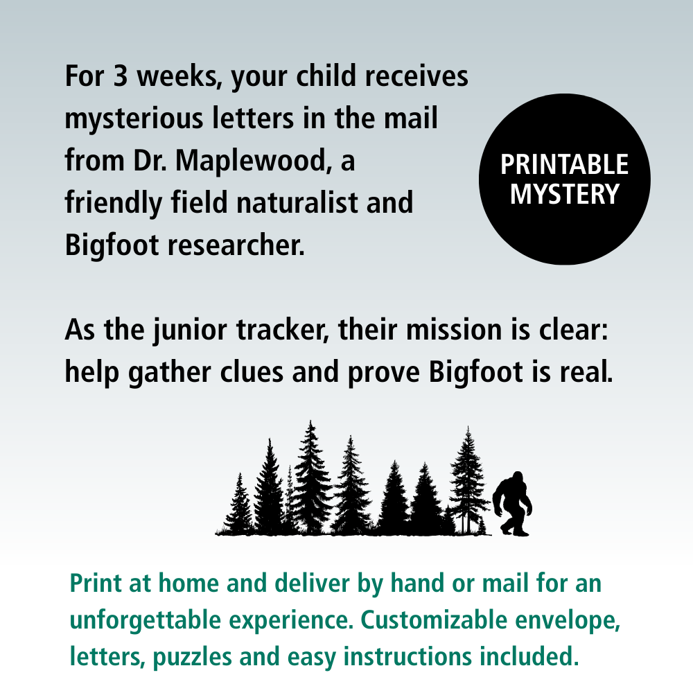 Mysteries & Legends The Search For Bigfoot: Printable Mail Order Mystery For Ages 6-12 Was Now $16.50 Sale Spark curiosity and confidence with this printable Bigfoot Mail Mystery for kids! Your child will receive a series of fun letters from a bigfoot researcher who needs their help. Each delivery includes clues, puzzles, and imaginative activities designed to build problem-solving skills and inspire wonder.This positive, screen-free adventure is perfect for ages 6–12 and ideal for homeschool, birthdays, rainy days, or anytime a little magic or mystery is needed.🌲 What’s Included:• Printable letters & fillable envelope template• Word searches, puzzles, and nature-based clues• Parent instruction sheet for easy delivery• Final certificatePrint at home and deliver by hand or mail for an unforgettable experience.✨ Encouraging, creative, and just the right amount of mysterious — perfect for curious kids who love cryptids and forest adventures! Adventure and intrigue. Quantity Enter an amount $ Add to Cart Add to Cart You may also like Sale Mysteries & Legends Pirate Treasure: Printable Mail Order Mystery For Ages 6-12 $17.50 Sale Mindful Moments: Bedtime Sleep Fairy Note Cards To Solve Bedtime Struggles $3.50 Sale Hiking & Exploration Official Bigfoot Field Report $2